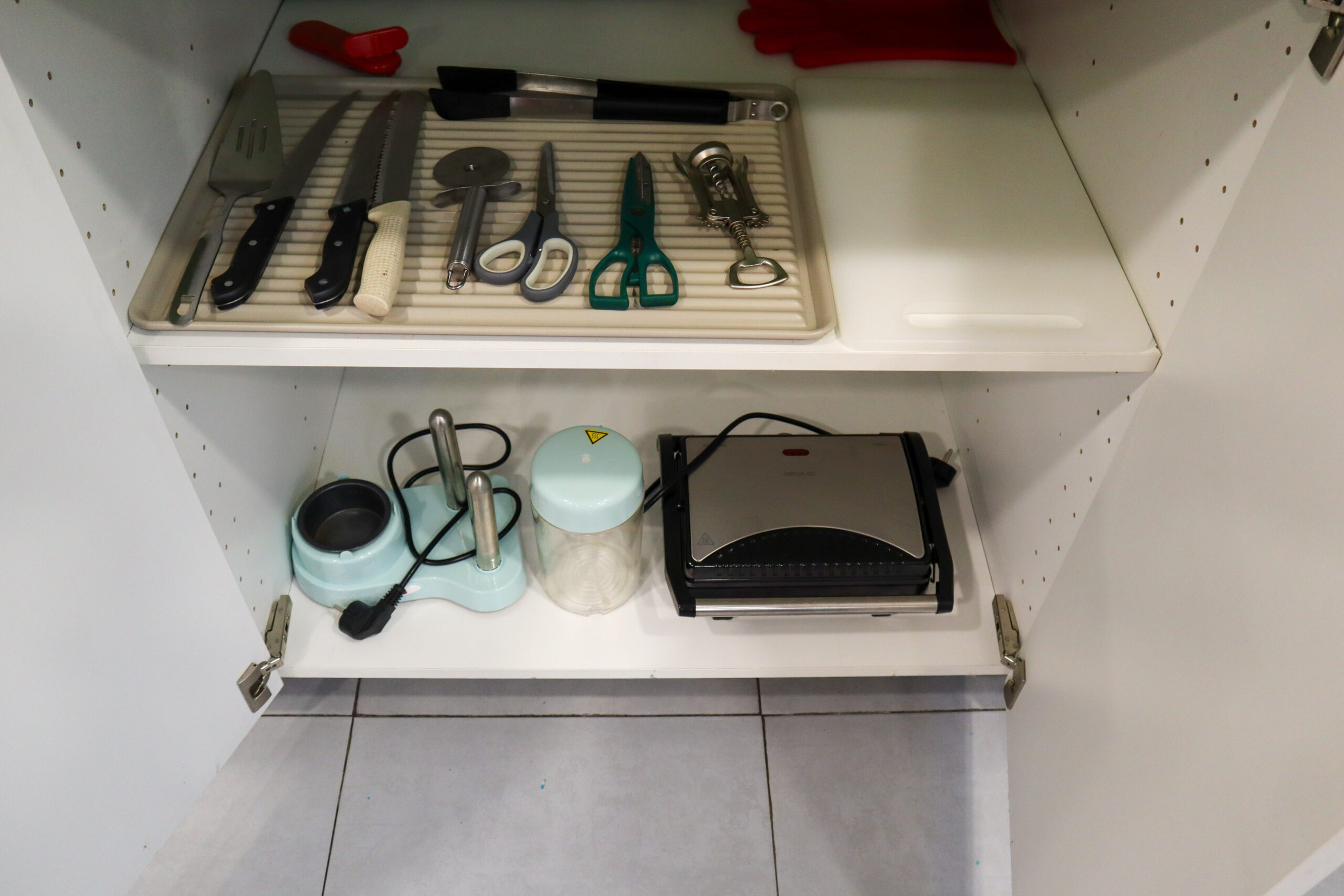 • Equipado con cuchillos, tijeras, cortapizzas, pinzas, tabla de cortar, papel de horno, jarritas de agua…